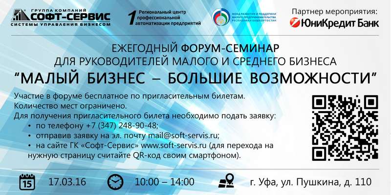 Специально для руководителей субъектов малого и среднего бизнеса, ГК «Софт-Сервис», совместно с Фондом развития и поддержки малого предпринимательства Республики Башкортостан, 17 марта организует семинар «Малый бизнес – большие возможности».