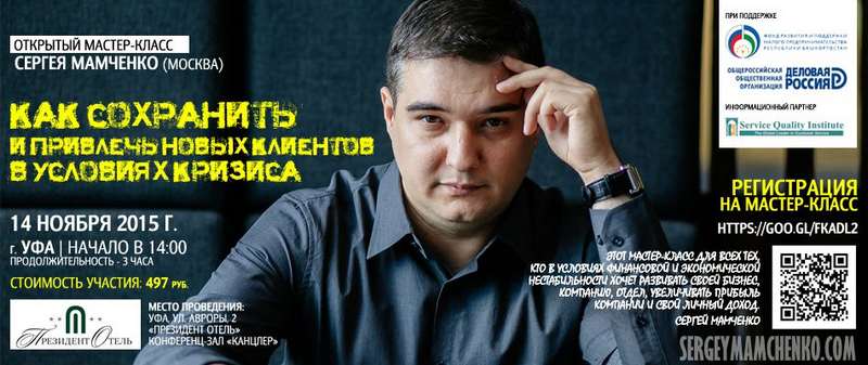 14 ноября 2015 г. в «Президент Отеле» состоится открытый мастер-класс руководителя Департамента инновационных проектов компании «Гарант» (г. Москва) Сергея Мамченко «Как сохранить и привлечь новых клиентов в условиях кризиса».