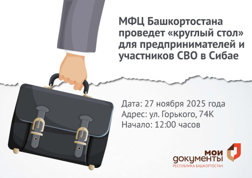27 ноября 2025 года в 12:00 часов в МФЦ города Сибай состоится круглый стол для субъектов малого и среднего предпринимательства на тему «Меры господдержки бизнеса, услуги для предпринимателей, организация предпринимательской деятельности участниками СВО». В мероприятии примут участие бизнес-шериф, представители Администрации городского округа города Сибай, АНО «Деловой Мир и социальные координаторы Фонда «Защитники Отечества».