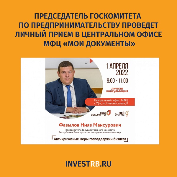 1 апреля с 9:00 до 11:00 в центральном офисе МФЦ «Мои Документы» по адресу г. Уфа, ул. Новомостовая, 8 председатель Госкомитета РБ по предпринимательству Нияз Фазылов проведет личный прием жителей и субъектов малого и среднего предпринимательства с целью оказания консультационной помощи, а также содействия в получении мер господдержки бизнеса.