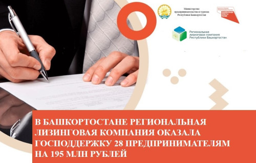 В текущем году Региональная лизинговая компания поддержала проекты 28 субъектов малого и среднего предпринимательства Республики Башкортостан на общую сумму 195 млн рублей. Финансирование было предоставлено в рамках реализации национального проекта «Малое и среднее предпринимательство и поддержка индивидуальной предпринимательской инициативы».